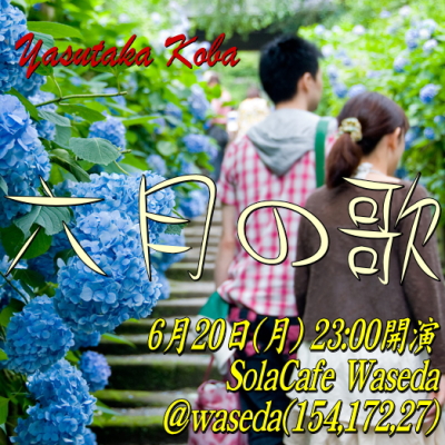 早稲田シムソラカフェにてYasutaka Kobaさんの 『6月の歌』と題したライブが6月20日夜11時(JPT) より開催されます。 今回は雨の歌とウエディングソングをミックスした曲目を 演奏して下さるそうですので、お楽しみに。^^